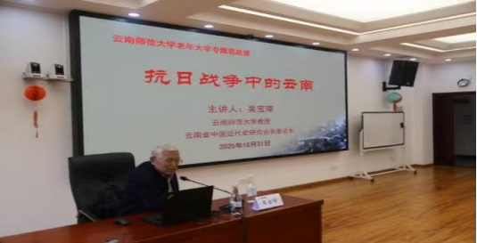 为深入学习贯彻习近平总书记在纪念中国人民抗日战争暨世界反法西斯战争胜利 80 周年大会上的重要讲话精神,铸牢老年学员的思想政治根基,10 月 31 日,云南师范大学老年大学在联大校区开设了以“抗日战争中的云南”为主题的专题思政课。百余名老年学员齐聚课堂,重温烽火岁月,感悟家国情怀。